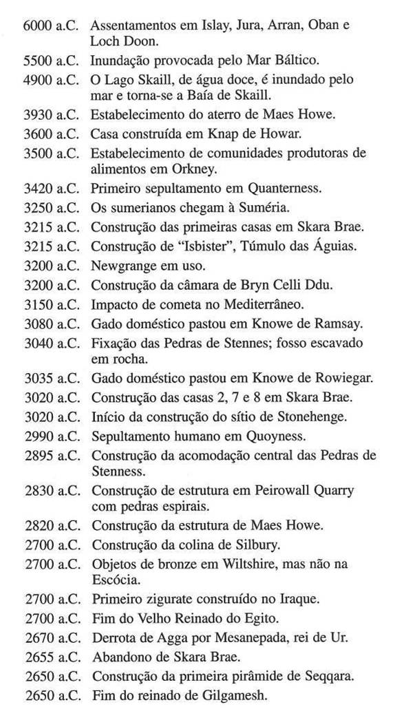 Com a evolução de sua astronomia observacional, inventaram um sofisticado sistema de medição (a jarda megalítica) que se tornou padrão em seus domínios, e construíram centenas de enormes círculos de pedras que funcionavam como declinômetros de horizonte, proporcionando calendários precisos e sistemas de alarme cometários. A "arte" megalítica do Povo da Cerâmica Canelada, usada para decorar muitas de suas estruturas, era uma forma primitiva de escrita, e aprendemos a ler alguns de seus símbolos quando recriamos a máquina-calendário que Uriel descreveu a Enoch. Em algum momento antes do ano 3.150 a.C., o Povo da Cerâmica Canelada percebeu outro cometa em trajetória de colisão com a Terra e decidiu espalhar seu conhecimento de sobrevivência o máximo possível. Uma das pessoas que eles levaram do Oriente Médio para as Ilhas Britânicas a fim de aprender os segredos de sua astronomia foi Enoch. O Livro de Enoch descreve claramente visita a Newgrange com o seu Muro Branco de Cristal, centenas de anos antes da construção das pirâmides do Egito. É provável que os construtores sumerianos tenham sido uma ramificação desse Povo da Cerâmica Canelada e que outro subgrupo possa ter-se dirigido para a China. Vestígios das crenças desse Povo da Cerâmica Canelada sobreviveram em dois segmentos principais: nos ensinamentos do Judaísmo enochiano e nas lendas celtas dos druidas. Esses dois segmentos juntaram-se novamente por volta do ano 580 a.C., na época da queda do Templo de Salomão, quando uma princesa da linhagem de Davi foi levada para a Irlanda por motivos de segurança e estabeleceu a linhagem real dos altos reis de Tara, casando-se com um rei nativo. O Império Romano procurou, sem sucesso, destruir esses dois segmentos da crença enochiana durante o pri¬meiro século depois de Cristo. Logo que o Cristianismo jacobita apareceu no País de Gales e, mais tarde, na Irlanda e na Escócia, ele foi facilmente aceito. O que sobrara do Druidismo nativo foi prontamente absorvido pelo Cristianismo celta. Essa forma enochiana de Cristianismo sobreviveu até o século VI d.C., e pudemos rastreá-lo por meio dos ensinamentos dos primeiros santos celtas e dos poemas de Taliesin. Os sítios do Povo da Cerâmica Canelada sempre foram considerados sagrados e durante os últimos 3 mil anos foram objeto de disputas por parte das várias linhagens das casas reais da Bretanha e dos descendentes dos sacerdotes do Templo de Jerusalém. Por conseguinte, essa é a historia que conseguimos desvelar. Mas o que aconteceu com nossa busca?